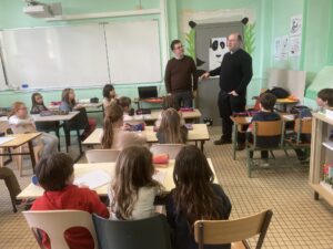 Les enfants de CE2, lors d’une séance de catéchèse, ont eu le plaisir de vivre un temps de questions/réponses avec le Père Laurent Perrée, prêtre et Francis Besnier, diacre.